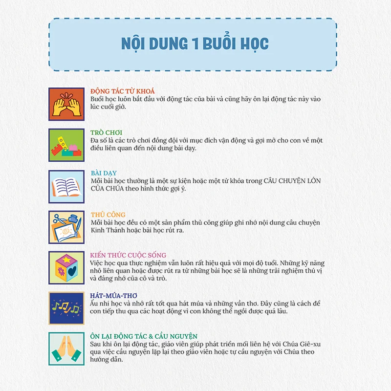 Bao gồm động tác từ khóa, trò chơi, bài dạy, thủ công, kiến thức cuộc sống, hát – múa – thơ, ôn lại động tác và cầu nguyện.